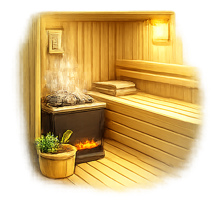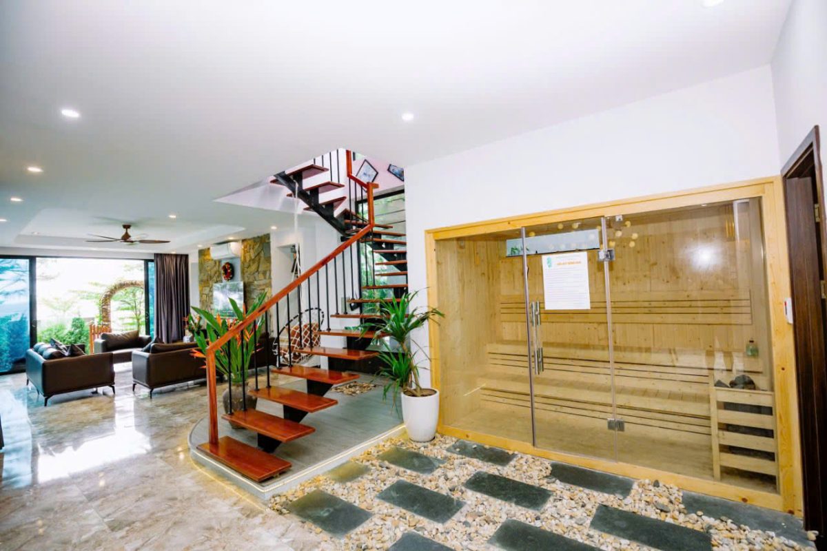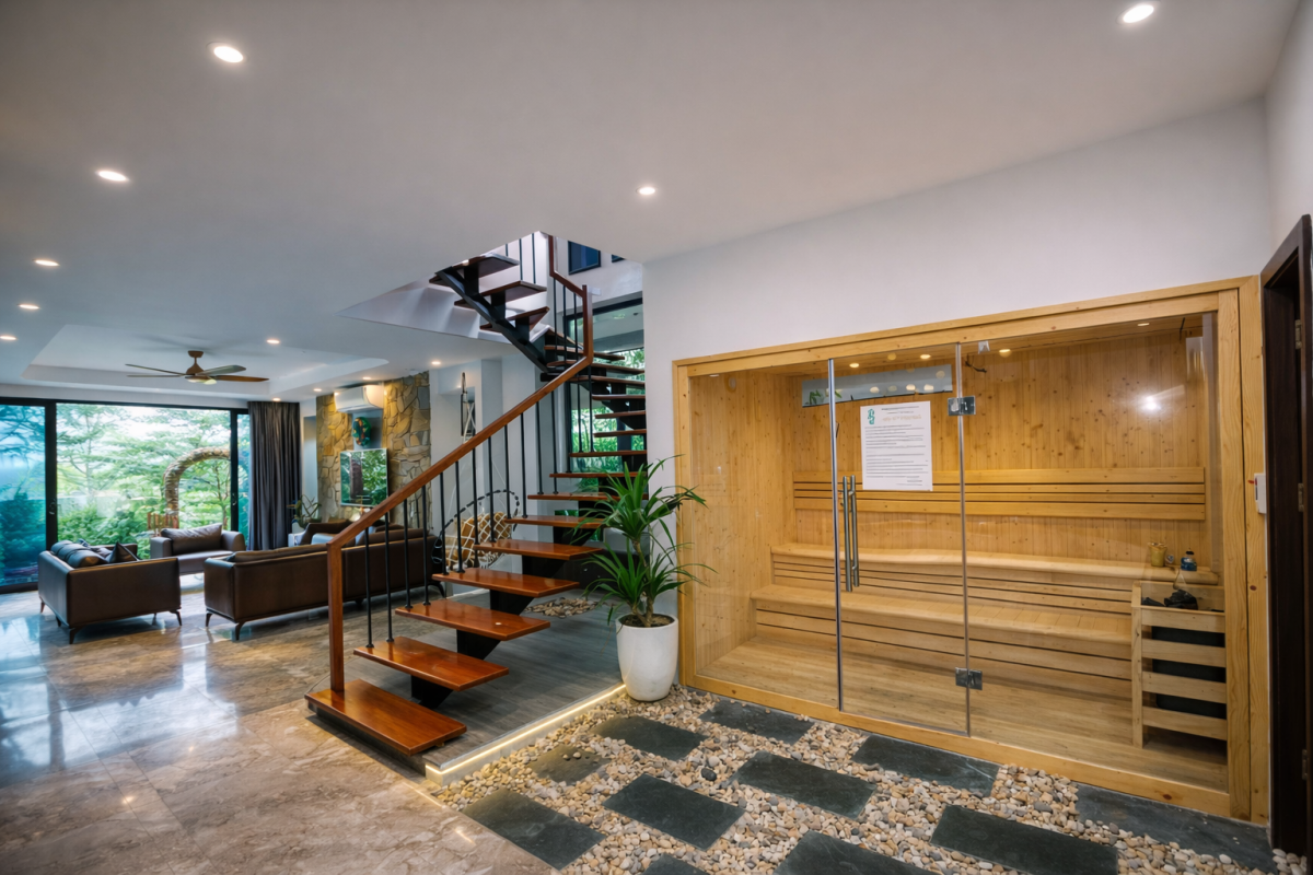 Phòng xông hơi khô ốp gỗ thông Bắc Âu, sức chứa đến 8 người – trải nghiệm wellness riêng tư ngay tại villa.