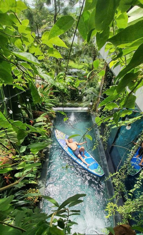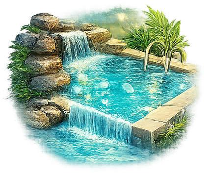 Bể bơi rộng hơn 20m², với thác nước và 9 đầu sục massage đa điểm; nước ấm vào mùa Thu – Đông.